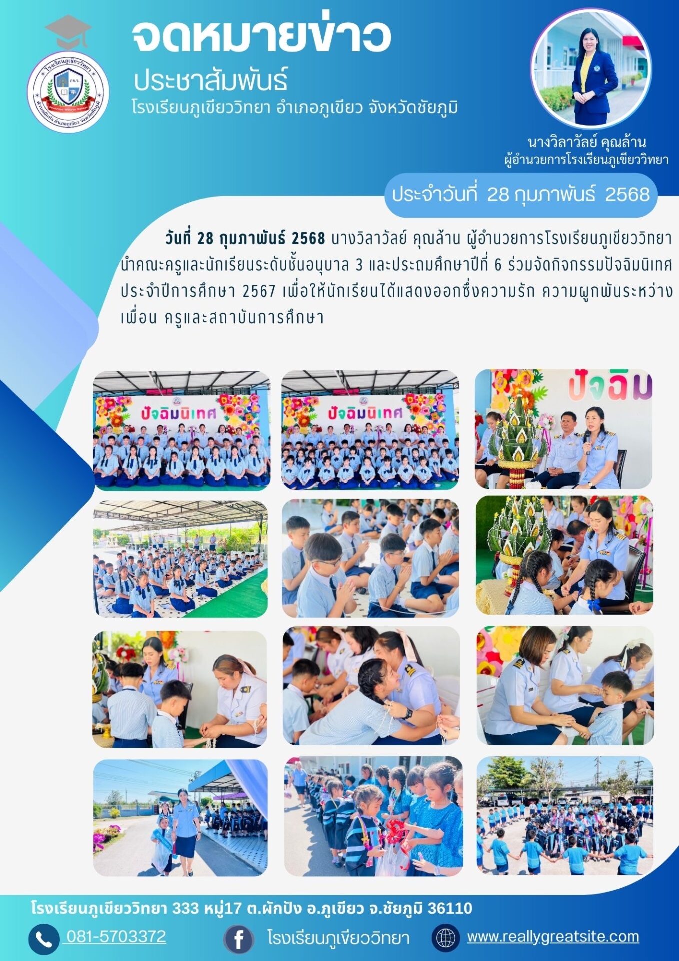 หน้าแรก ภาพกิจกรรม กิจกรรมปัจฉิมนิเทศ ปีการศึกษา 2567 ภาพกิจกรรม กิจกรรมปัจฉิมนิเทศ ปีการศึกษา 2567 โดย โรงเรียนภูเขียววิทยา - 28 กุมภาพันธ์ 2568 14 บทความที่เกี่ยวข้องเพิ่มเติมจากผู้เขียน ศึกษาธิการจังหวัด นิเทศ ติดตามและประเมินผล พิธีถวายพรชัยมงคล เนื่องในวันเฉลิมพระชนมพรรษา พระบาทสมเด็จพระเจ้าอยู่หัว กิจกรรมแลกของขวัญระหว่างนักเรียน ครูและบุคลากร เนื่องในโอกาสวันส่งท้ายปีเก่าต้อนรับปีใหม่ 2567 ข่าวประชาสัมพันธ์ พิธีรับวุฒิบัตร ปีการศึกษา 2567 8 มีนาคม 2568 กำหนดการเดือนตุลาคม 2567 18 ตุลาคม 2567 ศึกษาธิการจังหวัด นิเทศ ติดตามและประเมินผล 5 สิงหาคม 2567 ภาพกิจกรรม ศึกษาธิการจังหวัด นิเทศ ติดตามและประเมินผล 5 สิงหาคม 2567 พิธีถวายพรชัยมงคล เนื่องในวันเฉลิมพระชนมพรรษา พระบาทสมเด็จพระเจ้าอยู่หัว 26 กรกฎาคม 2567 กิจกรรมแลกของขวัญระหว่างนักเรียน ครูและบุคลากร เนื่องในโอกาสวันส่งท้ายปีเก่าต้อนรับปีใหม่ 2567 29 ธันวาคม 2566